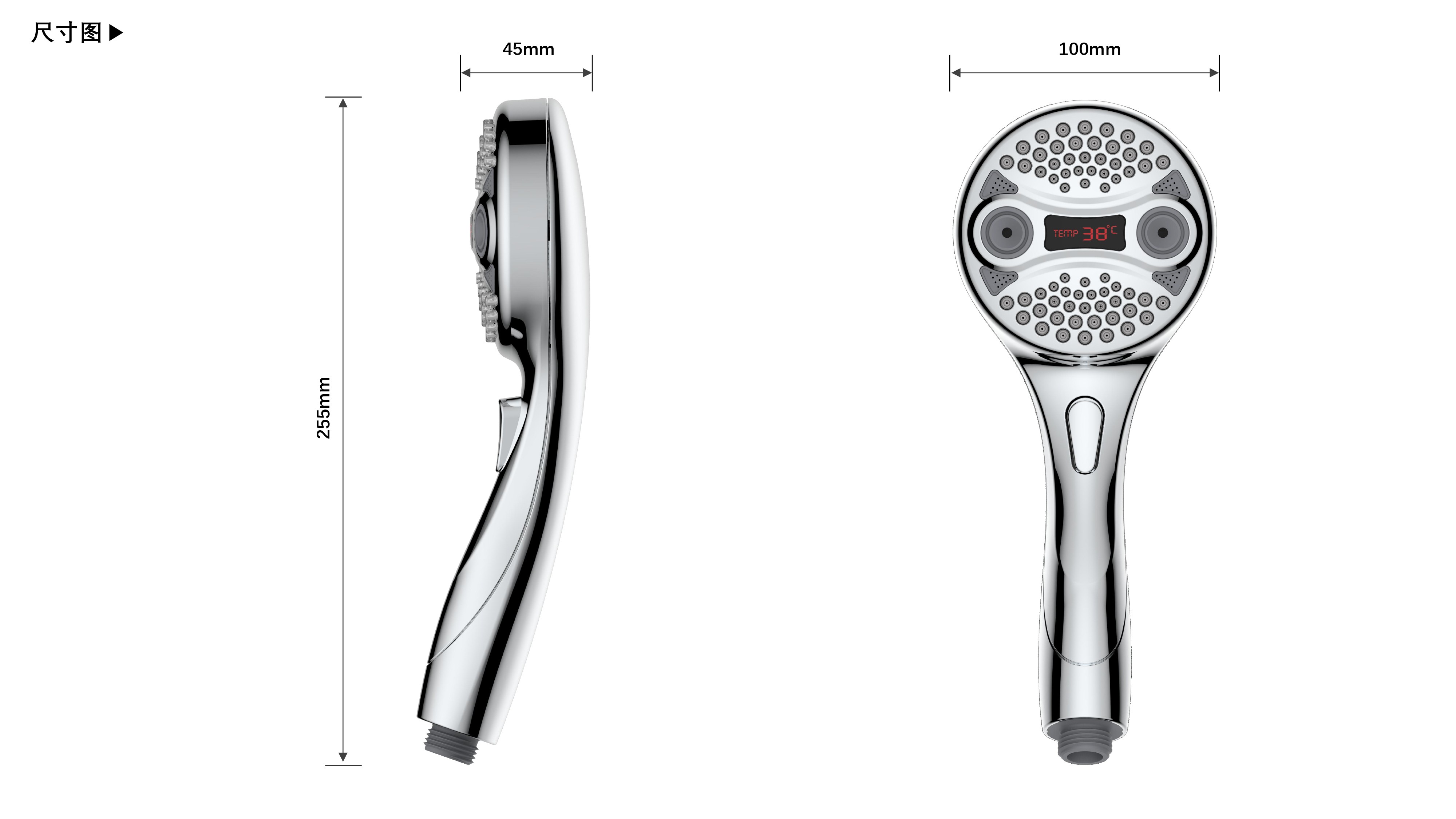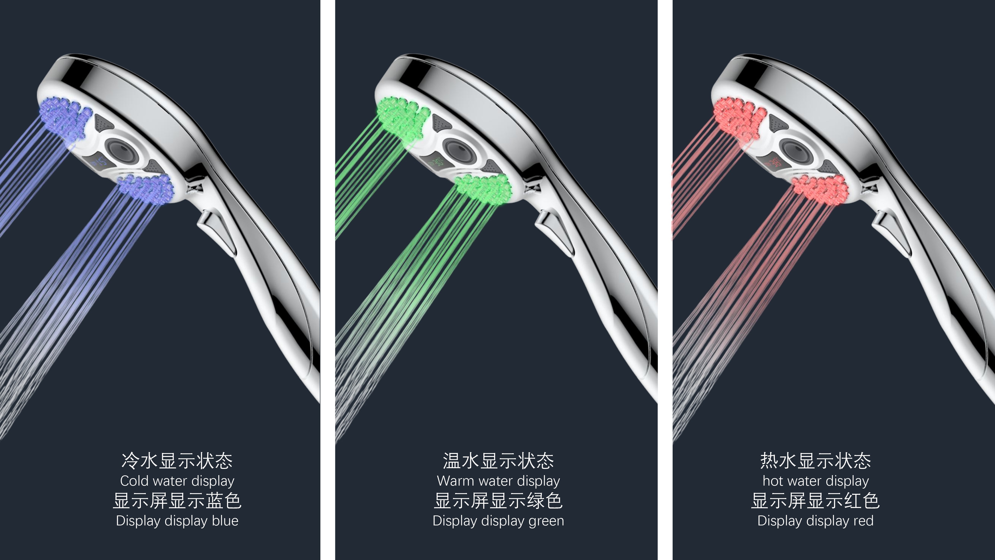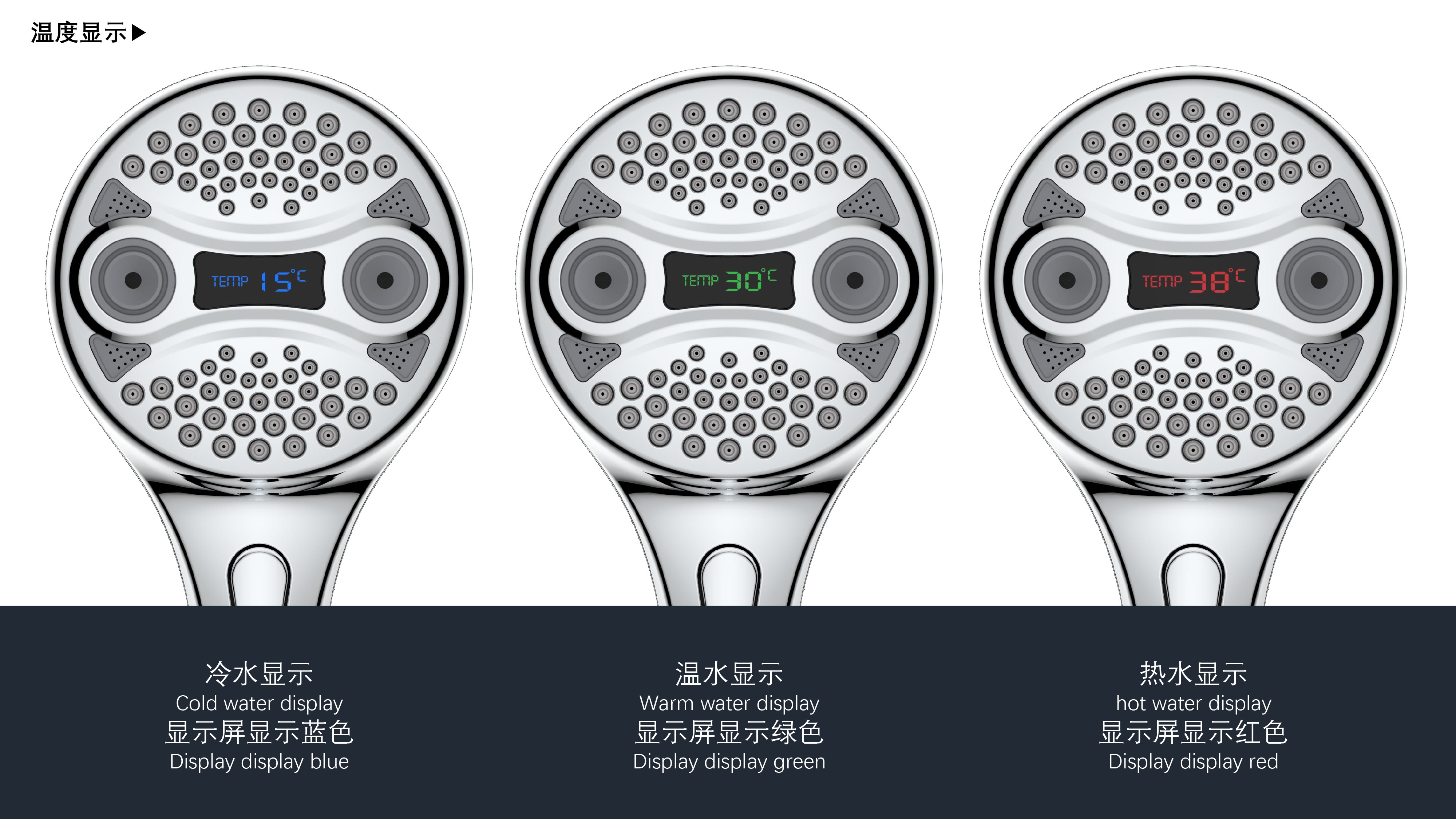 三功能溫顯花灑;獨(dú)特E.T.外觀設(shè)計(jì);TPR出水孔,輕撥除垢;LED三色出水,看得見(jiàn)的水溫;按鍵切換三檔模式出水;握感舒適防滑
