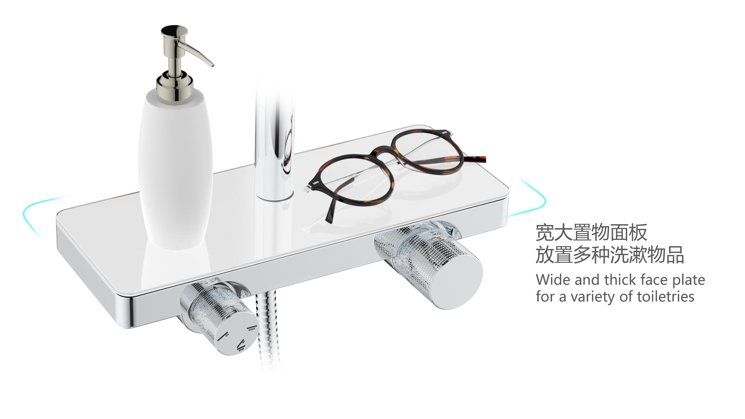 至美星空花灑;寬大置物面板放置洗護(hù)用品;旋轉(zhuǎn)切換頂噴/花灑/下出水